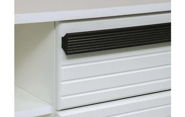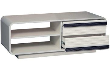 Конструкция с 2-я секциями, справа 2-а выдвижных ящика для хранения мелких предметов, слева открытые полки для техники.