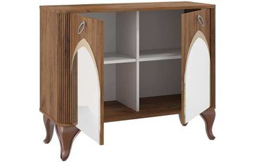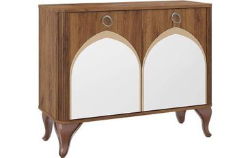 Модель имеет две секции с полками и распашными дверцами с зеркальными панелями.