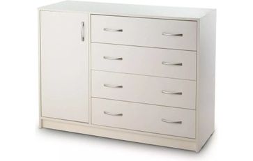 Современный и вместительный комод КМ-1 подойдет как и для спальни, так и для прихожей. Комод оснащен четырьмя выдвижными ящиками и распашной дверцей, за которой находится одна полка. Ящики установлены на шариковые направляющие. None Есть доставка.