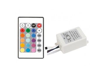 RGB-контроллер с IR ДУ, имеет 16 статических и 4 динамических программ переключения, регулировка яркости. Выход 12V 72W, до 6A. Может управлять 10м RGB ленты. Габариты 63x35x22 мм. None