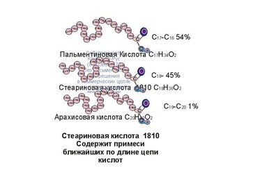 Химия импортного производства наименование вещества: Стеариновая кислота Марка 1810 Синонимы: Октадекановая кислота 1-Гептадеканкарбоксильная кислота Цетилуксусная кислота STEARIC ACID данная марка хорошо показывает себя в резинотехнике и пластмассах, хороший заменитель стеарина марок Т18 и Т23 Каталожный номер на стеариновую кислоту CAS 57-11-4 ОПИСАНИЕ СТЕАРИНОВОЙ КИСЛОТЫ: Белые кристаллы или порошок с характерным слабым запахом. Для марки 1810 запах более ощутим, чем для марки 1865. Существует множество марок отличных по иодному числу, цвету, чистоте. Стеариновая кислота всегда содержит в своем составе много Пальментиновой кислоты Лауриловой кислоты арахисовой кислоты, а также двух и трех основных жирных кислот.Содержание двух и трех основных кислот существенно ухудшают качество продукта, об их содержании и говорит Иодное число, чем оно меньше, тем качественнее продукт. В России этот параметр даже вошел в Название Стеарин Т 32 и стеарин Т18 означает что Иодное число в одном случае 32 в другом 18. Для сравнения в качественных кислотах импортного производства этот параметр не более 10. А вот содержание ближайших гомологов (Пальментиновой кислоты Лауриловой) кислоты никак не влияет на ее качество в большинстве производств. Поэтому для марки 1810 его не нормируют В среднем содержание стеариновой кислоты примерно 55% и колеблется от партии к партии, а для марки стеариновая кислота 1865 содержание стеариновой кислоты не менее 65% . Это очень хороший результат, поскольку стеариновая арахисовая и пальментиновая кислота разделяются крайне тяжело.