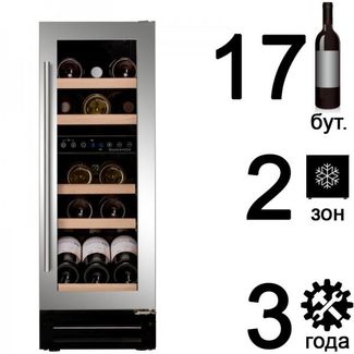 Винный холодильник шкаф Dunavox DX-17.58SDSK/DP - встраиваемый компрессорный винный шкаф для дома на 17 бутылок с 2 зонами охлаждения со стеклянной дверью в рамке из высококачественной нержавеющей стали. Узкий встраиваемый винный шкаф. Необходима предоплата 50%. Есть доставка.