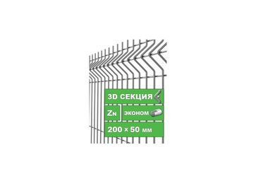 3D панельиз сварной сетки на основе металлического прутапокрытогозащитнымслоем цинка.Размер ячейки 200х50 мм. (эконом вариант). Данное ограждение может быть окрашено.Технические характеристики ограждения позволяют монтировать и демонтировать систему неограниченное количество раз.Применение: благодаря отсутствию слоя ПВХ, стоимость ограждения ниже, что позволяет существенно снизить затраты на ограждение участков территории, где внешний вид не является первоочередным.