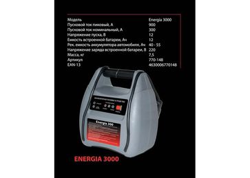 - Пусковое устройство ERGUS Energia 3000 (12В, 12Ач, 300А, 6,5кг) по выгодной цене 2 600 р. руб.;