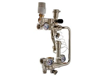 (VT.COMBI.0) В насосно-смесительном узле VALTEC COMBI для водяных теплых полов приготовление теплоносителя с температурой от 20 до 60 °С происходит за счет подмеса жидкости из обратной линии. Регулирование осуществляется двухходовым клапаном, установленным в подающем коллекторе и управляемым термостатической головкой с выносным погружным датчиком, который размещен на выходе смесительного узла.(При использовании контроллера отопления функция управления клапаном передается ему.) Балансировочный клапан в линии подмеса задает соотношение теплоносителя, поступающего из обратной линии вторичного контура и прямой линии первичного. Другие основные элементы узла: байпас с перепускным клапаном; встроенные шаровые краны для отключения циркуляционного насоса; автоматический воздухоотводчик; погружные термометры.