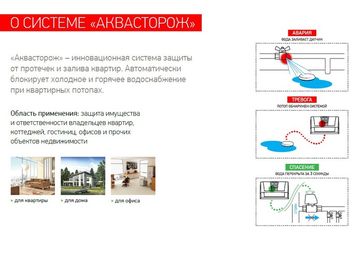 «Аквасторож» – инновационная система защитыот протечек и залива квартир. Автоматическиблокирует холодное и горячее водоснабжениепри квартирных потопах.Область применения: защита имуществаи ответственности владельцев квартир,коттеджей, гостиниц, офисов и прочихобъектов недвижимости