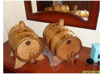Несмотря на небольшие размеры, это - полноценная бочка из плотного краснодарского дуба скальной породы, наиболее подходящего для виноделия и приготовления крепких янтарных напитков. Настольное исполнение, оцинкованные обручи, покрашенные в золотистый цвет, дубовый краник, подставка в комплекте. Благодаря чудесным свойствам скального дуба, сивушные масла распадаются на полисахара, а уксусная кислота преобразуется во фруктовые эфиры, образуя неповторимый букет ароматов. Получаемый напиток, как правило, бодрит, веселит, не вызывает сухости и похмелья. Небольшие габариты позволяют прекрасно вписываться в каждый интерьер.На главную витрину