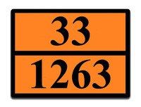 Табличка оранжевого цвета с обозначением в соответствии с требованиями ДОПОГ. Данная табличка опасных грузов имеет маркировку 33-1263 что соответствует обозначению краски. Оранжевая табличка опасных грузов имеет два вида обозначений. Верхняя строчка указывает на идентификационный номер опасности. Нижняя строчка содержит номер ООН. Характеристики опасного груза по ДОПОГ: