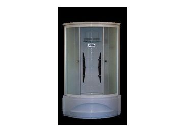 Комплектация : панель компьютерного контроля; 6 регулируемых форсунок гидромассажа за сидением; переключатель функций подачи воды; FM радио; массажер стоп; раздвижные шторки с роликовым механизмом, силиконовым уплотнителем и хромированными ручками; хромированный слив; подсветка купола; вентиляция; полка; душевая лейка с гибким шлангом; зеркало; смеситель; верхний тропический душ.