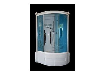 Комплектация : панель компьютерного контроля; 6 регулируемых форсунок гидромассажа за сидением; переключатель функций - гидромассаж, душ, верхний тропический душ, массажер ног; FM радио; массажер стоп; раздвижная шторка с роликовым механизмом, силиконовым уплотнителем и хромированной ручкой; хромированный слив-перелив; подсветка купола; вентиляция; полка; кран для наполнения поддона водой; душевая лейка с гибким шлангом; зеркало; смеситель; верхний тропический душ.