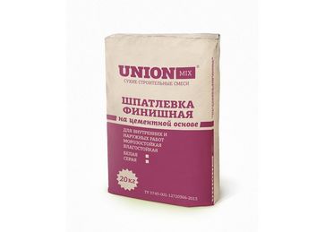 «UNION MIX» - сухая шпаклевочная смесь на цементной основе. Применяется для отделки фасадов зданий, сухих, влажных мокрых помещений по отштукатуренным, бетонным, кирпичным поверхностям. Качественно подготавливает поверхность под окраску и оклейку различными покрытиями. Используется для внутренних и наружных работ.