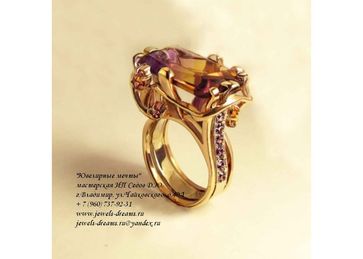 Золотое женское кольцо с аметрином, аметистами и цитринами. Материал: золото 585 пробы. Камни: 1 аметрин (8,3 карата), 11 аметистов (0,18 карата), 11 цитринов (0,18 карата). Вес кольца: 13,46 грамма. Размер: по желанию. None Страна производства: Россия