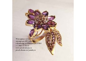 Золотое женское кольцо с родолитами и аметистами. Материал: золото 585 пробы. Камни: 18 родолитов (0,9 карата), 29 аметистов (6,46 карата). Вес кольца: 13,12 грамма. Размер: по желанию. None Страна производства: Россия