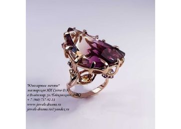 Золотое женское кольцо с аметрином, аметистами и цитринами. Материал: золото 585 пробы. Камни: 1 аметрин (16,9 карата), 6 аметистов (0,65 карата), 5 цитринов (0,58 карата). Вес кольца: 14,38 грамма. Размер: 18. None Страна производства: Россия