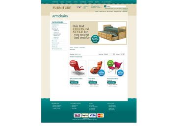 Свойства Темы: Furniture Store OpenCart Template разработана специально для магазинов Мебели и Интерьеров. Гармоничное сочетание зелёного, золотого и бежевого цвета. Модный бордюр зигзагом. Это лучшая декорация для показа мебели для жилых помещений - Столов, Стульев, Кресел, Диванов, Кроватей, Кухонных гарнитуров, Книжных шкафов, а также для показа Садовой и Офисной мебели. Очень красивый чистый и профессиональный дизайн.