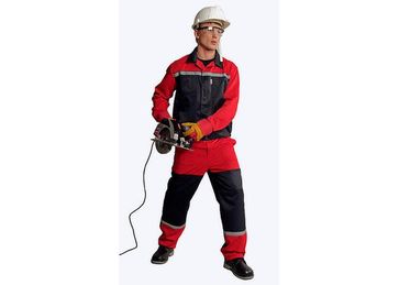 Костюм рабочий брючный. Куртка укороченная прямого силуэта с центральной застежкой на петли и пуговицы, с притачным поясом на резинке. Отложной воротник.Кокетки и рукава выполнены из отделочной ткани. Куртка оснащена нагрудными и нижними карманами. Брюки на притачном поясе. Передние половинки брюк комбинированные из отделочной ткани, с 4-мя функциональными карманами. По линии кокеток на полочках, спинке и по низу брюк проходит световозвращающая полоса. В области локтей и коленей усиления. Все швы с контрастной отстрочкой.Цвет: черный с краснымТкань: смесовая (65% полиэстер, 35% хлопок), пл. 210 г/м2, ВОРазмер: с 88-92 по 120-124Рост: 170-176, 182-188Защитные свойства: Ву Ми З