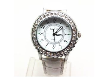 Роскошные кристаллы вокруг корпуса Корпус из нержавеющей стали и белый кожаный ремешок Бесшумное движение Белый аналоговый циферблат с черными цифрами Водоотталкивающие (не для купания и подводного плавания) Батарейка в комплекте