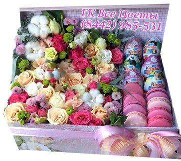 Закажите Букет-цветы в большой коробке с макаруни и киндер-яйцом у компании Лавка подарочных корзин в Волгограде в Волгограде на портале Alloy: