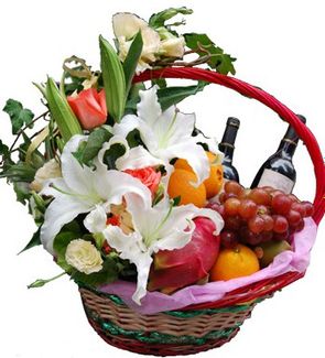 Закажите Корзина с фруктами, вином и цветами Лилии у компании Лавка подарочных корзин в Волгограде в Волгограде на портале Alloy: