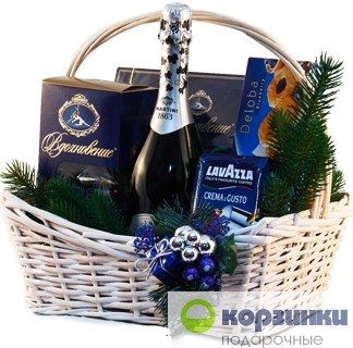 Состав подарочной корзины: игристый напиток в подарок, конфеты ВДОХНОВЕНИЕ (240 г), кофе в зернах элитное, печенье ( 100 гр.), конфеты "Вдохновение" (170 гр.), корзина плетеная, украшенная еловой веткой с новогодней вставкой. 500