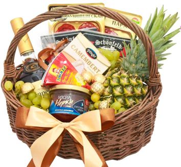 Гастрономические подарочные продуктовые корзины составом: Ананас Виноград Сырная нарезка (в вакуумной упаковке) -2шт. Колбасная нарезка (в вакуумной упаковке) -2шт. Сыр «Camembert» Сыр «Blue» Плитка горького шоколада Красная икра  напиток в подарок 500