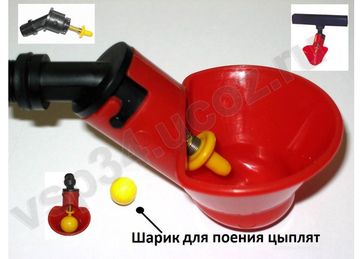 Шарик для поения цыплят. Для содержания цыплят предусмотрена дополнительная комплектация шариком. Свободно плавающий шарик обеспечивает рациональное поение птицы, начиная с суточного возраста. Шарик давит на шток, и вода заполняет чашку поилки. Как только чашка наполнена, шарик свободно плавает, не нажимая на шток, вода перестаёт поступать в микрочашку (шарик приобретается отдельно).