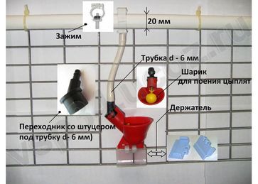 Для содержания цыплят предусмотрено дополнительная комплектация шариком. Свободно плавающий шарик обеспечивает рациональное поение птицы, начиная с суточного возраста. Шарик давит на шток, и вода заполняет чашку поилки. Как только чашка наполнена, шарик свободно плавает, не нажимая на шток, вода перестаёт поступать в микрочашку. (шарик приобретается отдельно)