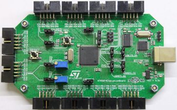 STM32F4EvaluationBoard – высокопроизводительная универсальная отладочная плата для микроконтроллеров серии STM32F4 позволяет изучать возможности микроконтроллеров серии STM32F4 и легко разрабатывать собственные приложения. В комплект поставки входит все необходимое, чтобы немедленно начинать разработки, как новичкам, так и опытным пользователям. Основанная на STM32F407VGT6, плата имеет интегрированный лицензионный отладчик ST-LINK/V2, светодиоды и кнопки, 2 переменных резистора для оценки возможностей встроенного АЦП (один из резисторов может служить для установки требуемого уровня внешнего опорного напряжения), встроенный преобразователь USB-UART, встроенный USB2.0 HUB, а также разъем USB AM-BM 2.0. Наличие встроенного USB2.0 HIGH SPEED хаба позволяет производить прошивку, отладку, приём и передачу данных через встроенные в микроконтроллер UART или USB подключая только один USB кабель. STM32F4EvaluationBoard полностью совместима с доступным на веб-сайте www.st.com большим количеством свободных и готовых к выполнению примеров приложений. Отличительные особенности:• Микроконтроллер STM32F407VGT6, основанный на 32-разрядном ядре ARM Cortex-M4, с 1 МБайт Flash памяти, 192 кБайт ОЗУ, максимальной тактовой частотой ядра 168МГц и производительностью до 210 DMIPS в корпусе LQFP100;• Встроенный отладчик ST-LINK/V2 с выбором режима работы, позволяющим использовать набор как автономный STLINK/ V2 (с разъемом SWD для программирования и отладки);• Подача напряжения питания на плату: через шину USB или от внешнего источника питания 5 В;• Источник питания внешних приложений с выходным напряжением 3,3В;• Встроенный преобразователь USB-UART на основе FT232RL;• 2 переменных резистора для оценки возможностей встроенного АЦП;• 2 перемычки (BOOT0 и BOOT1) для возможности оценки всех возможных BOOT