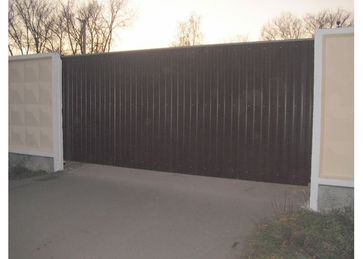 Откатные ворота на базе комплектующих "Алютех" с заполненим полотна ворот профлистом. По желанию Заказчика конструкция комплектуется электроприводом с пультом дистанционного управления.