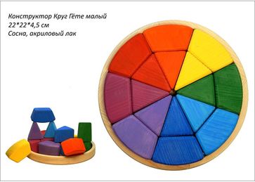 Маленький круг Гёте. Содержит в себе 8 основных цветов (по версии Гёте). 16 деталей, этого конструктора-мозаики, будут способствовать благоприятном развитию способностей конструирования, смешивания цветов, фантазии, тактильных чувств и аккуратности. Острые углы отсутствуют, по этому можно оставлять ребёнка с этой игрой на едине, не переживая, что он травмируется ей.