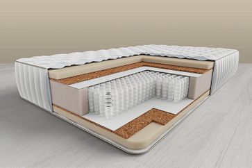 В качестве наполнителей здесь присутствуют гипоаллергенная пена Ортофоам и натуральное кокосовое волокно. Относительно пружинного блока сочетание материалов проложено симметрично. 4 см пены дополняют 1 см кокоса – каждая поверхность получается анатомической: подстраивается под изгибы тела и способствует комплексному восстановлению организма. Косовая койра помогает пружинам распределять нагрузку и повышает упругость матраса.