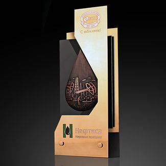 Оригинальный подарок, изготовленный с использованием фирменной символики, несомненно, займет важное место рабочего кабинета обладателя. В изделии гармонично соединены современные материалы и технологии, подчёркивающие образ динамично развивающейся компании. Особую выразительность изделию придаёт капля нефти с выполненным на ней рельефным изображением нефтяных установок.